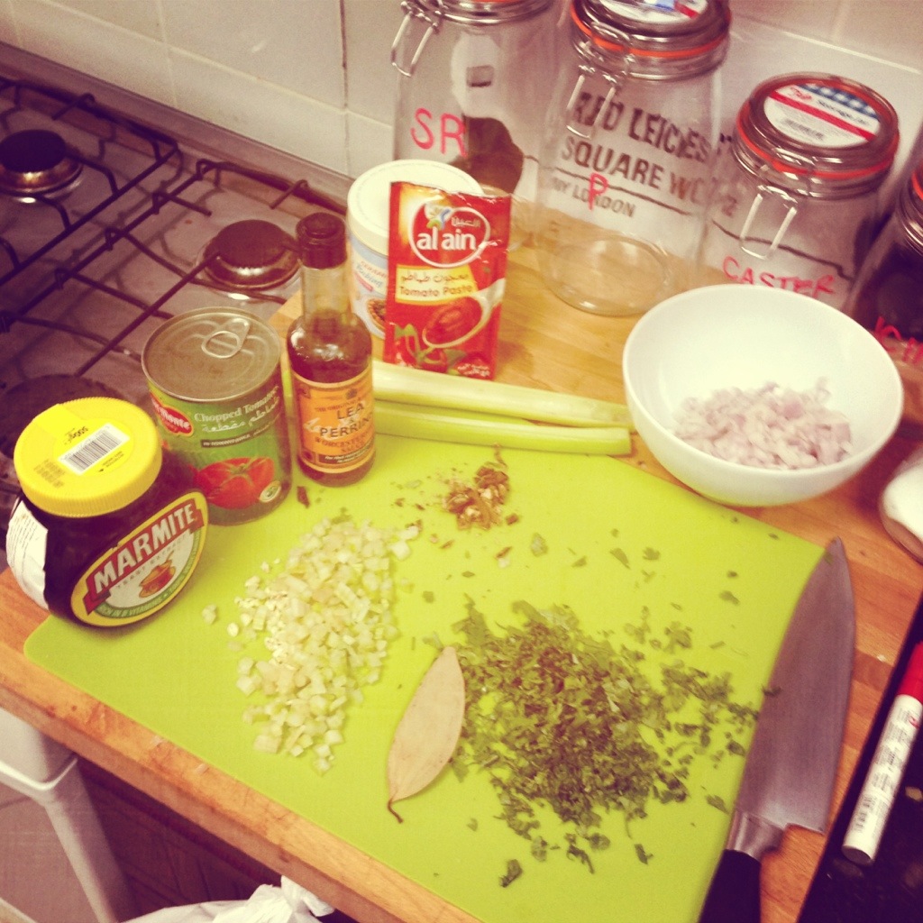 - Add tins of tomatoes, tomato purée, garlic, red wine, marmite, Lea & Perrins, salt and pepper, bay leaf, and parsley.