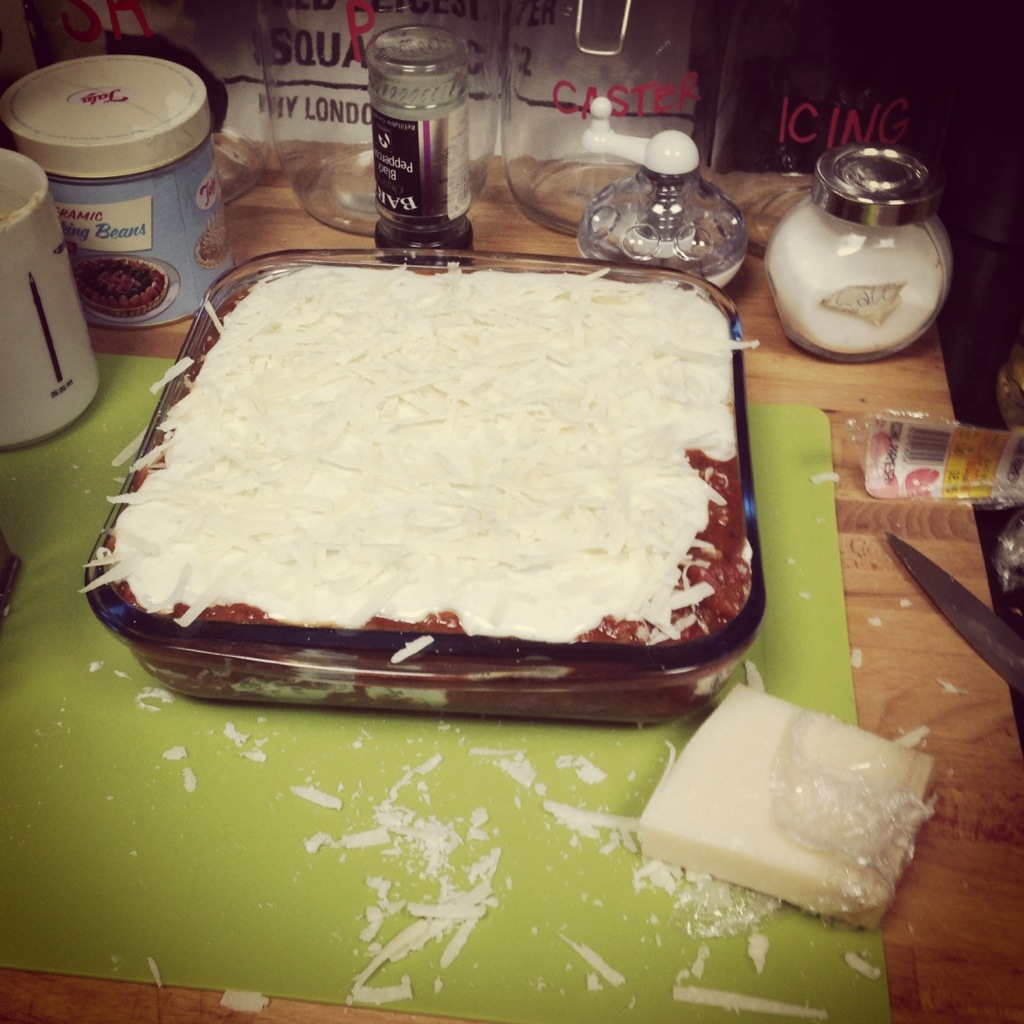 - Top with béchamel sauce, and sprinkle with a generous layer of grated Parmesan cheese.
